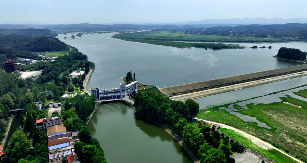 ↑8月18日拍摄的位于安徽省六安市裕安区的淠河总干渠渠首横排头水利枢纽(无人机照片)。新华社发(陈力摄)