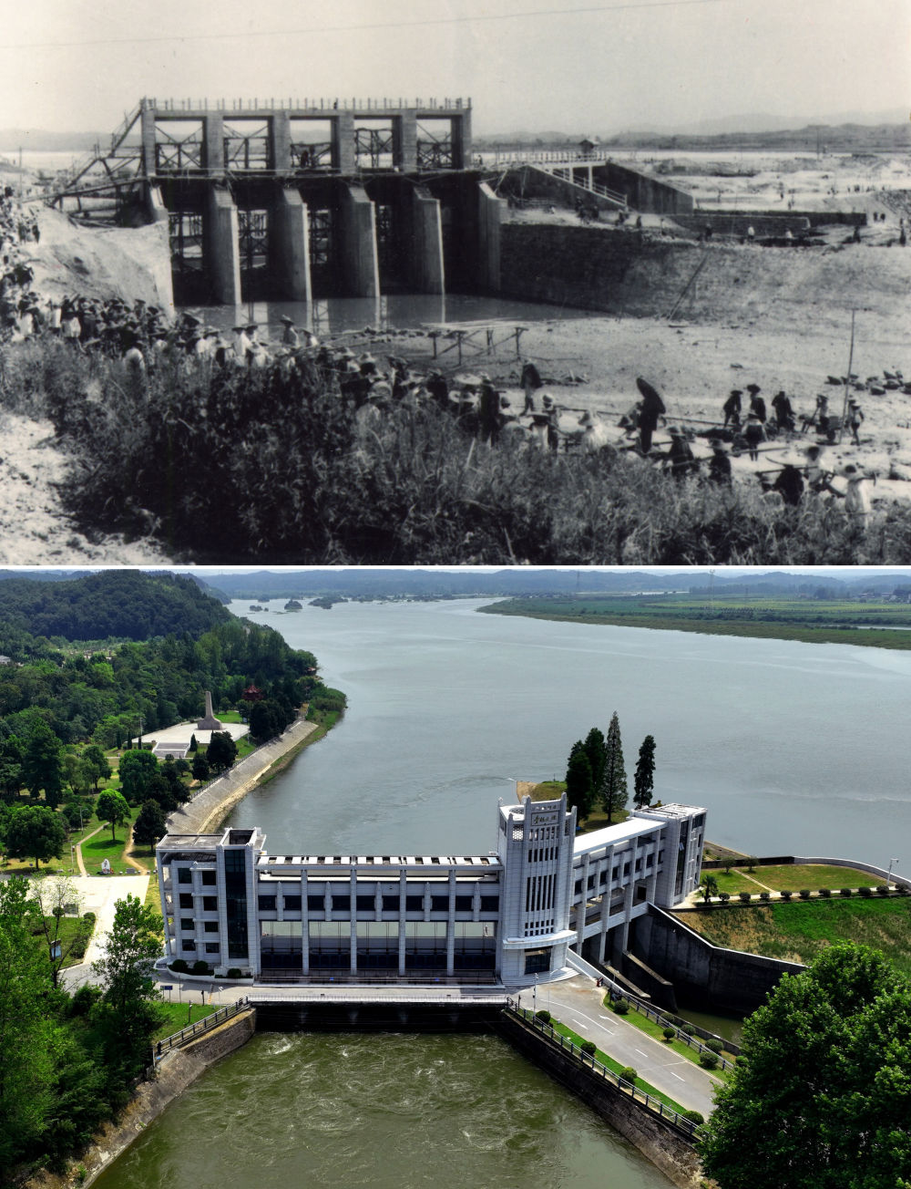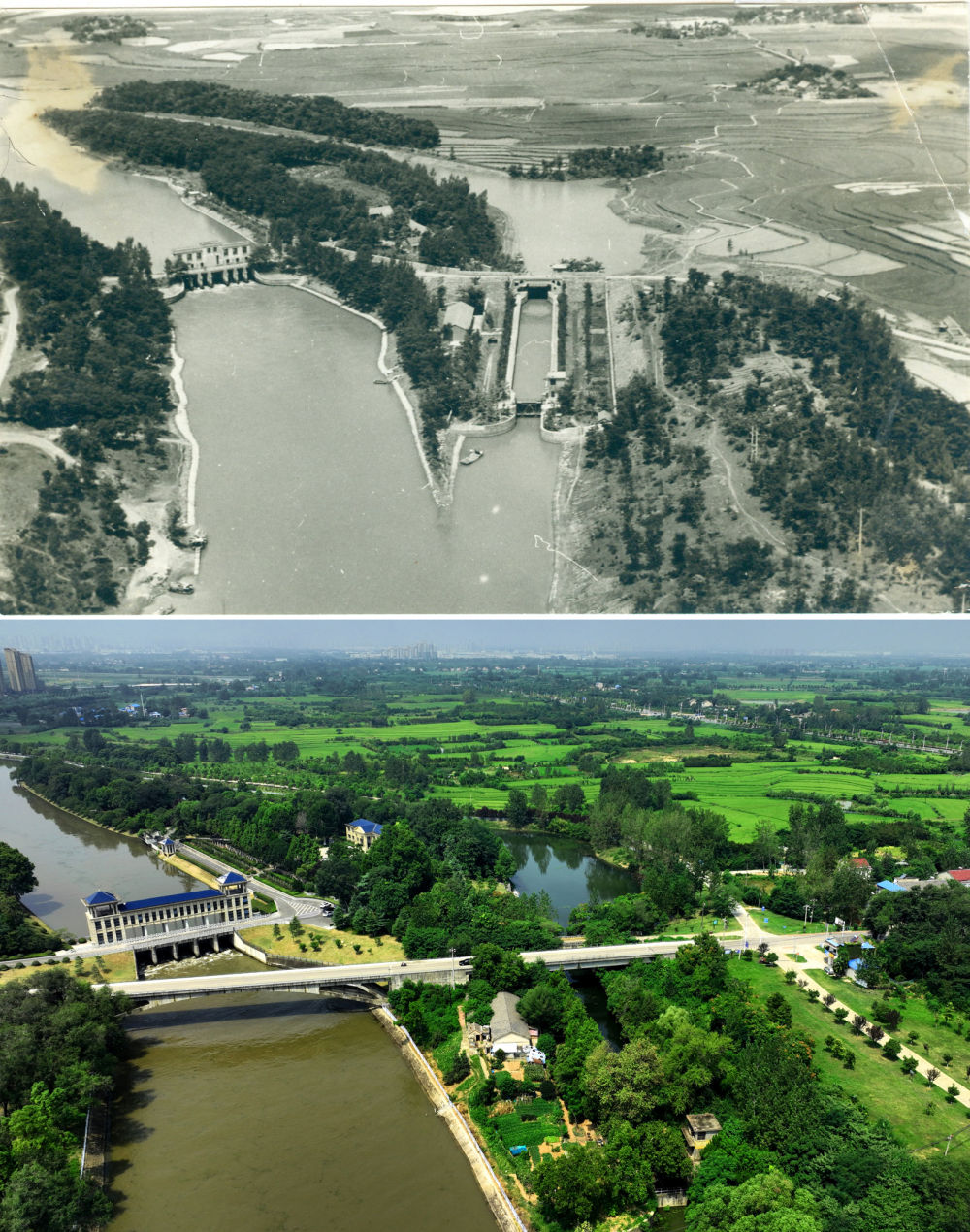 ↑这是一张拼版照片。上图为:1959年拍摄的位于安徽省六安市裕安区的淠河总干渠渠首横排头水利枢纽(新华社发 田准摄);下图为:2023年8月18日拍摄的淠河总干渠渠首横排头水利枢纽(无人机照片,新华社记者杜宇摄)。新华社发