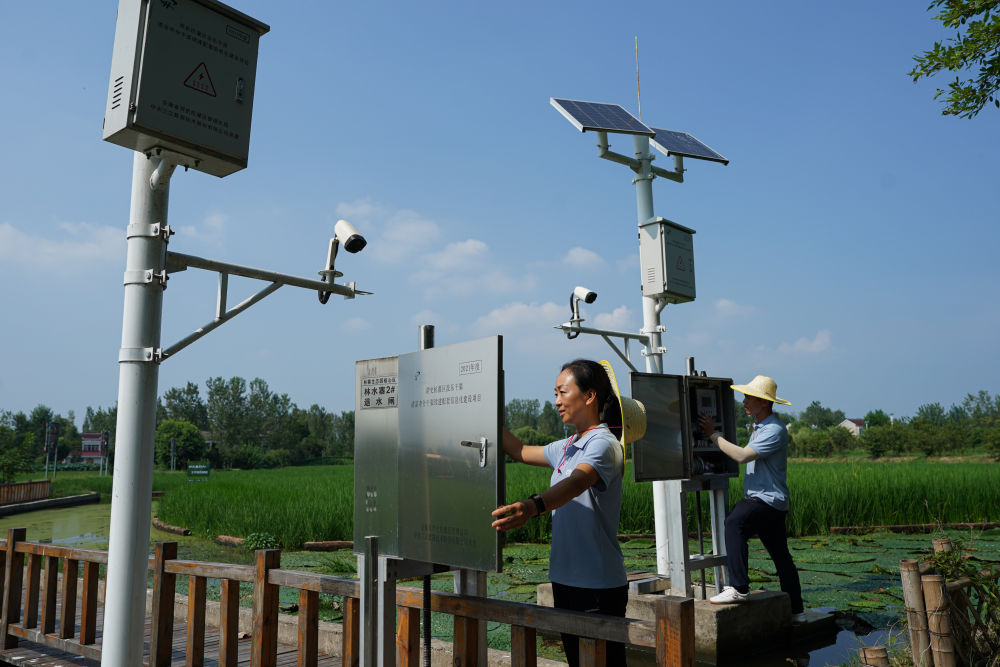 ↑8月18日,在位于安徽省六安市裕安区的清凉寺分渠灌区林水寨生态园,工作人员操作水闸控制稻田水位。新华社记者 杜宇 摄