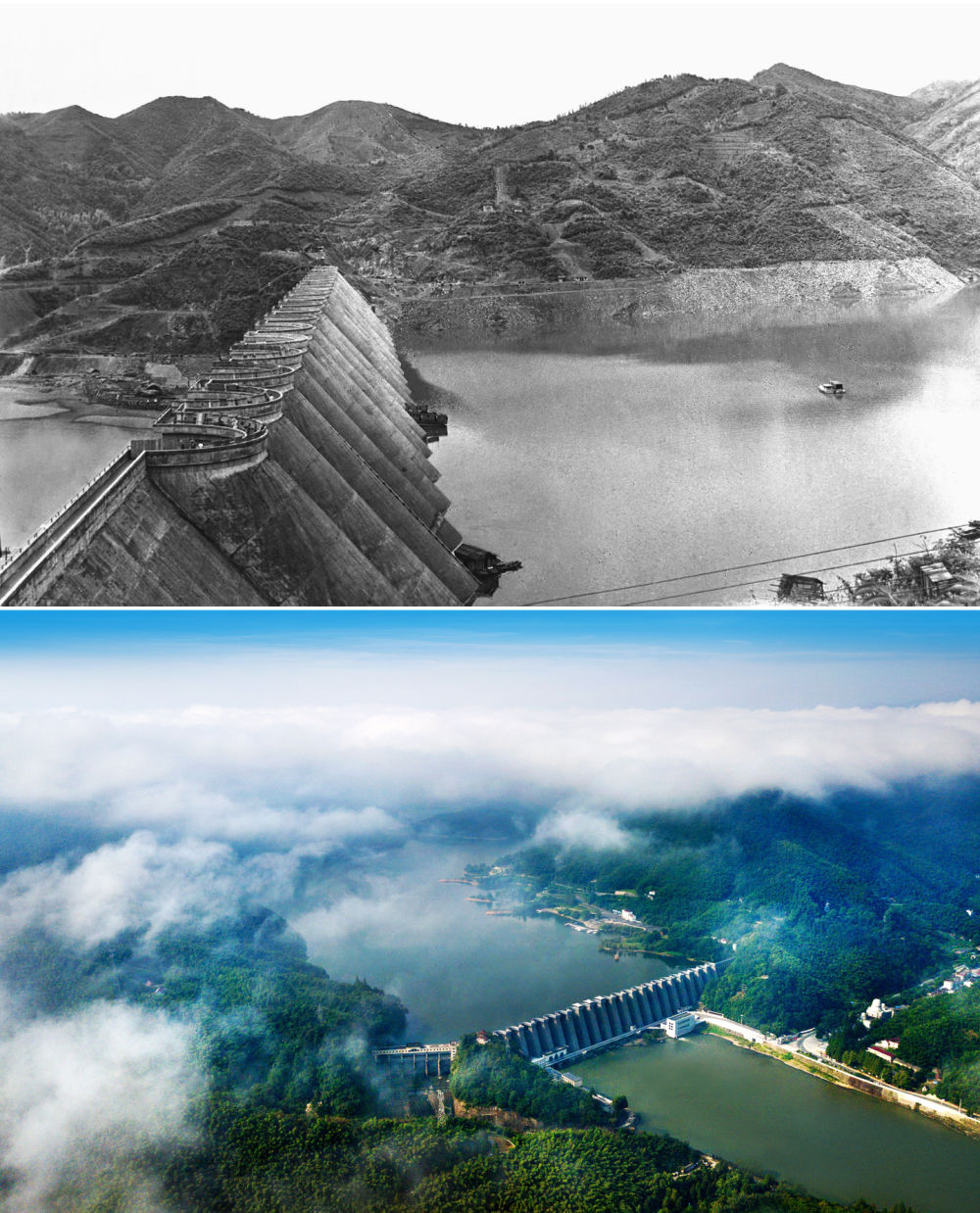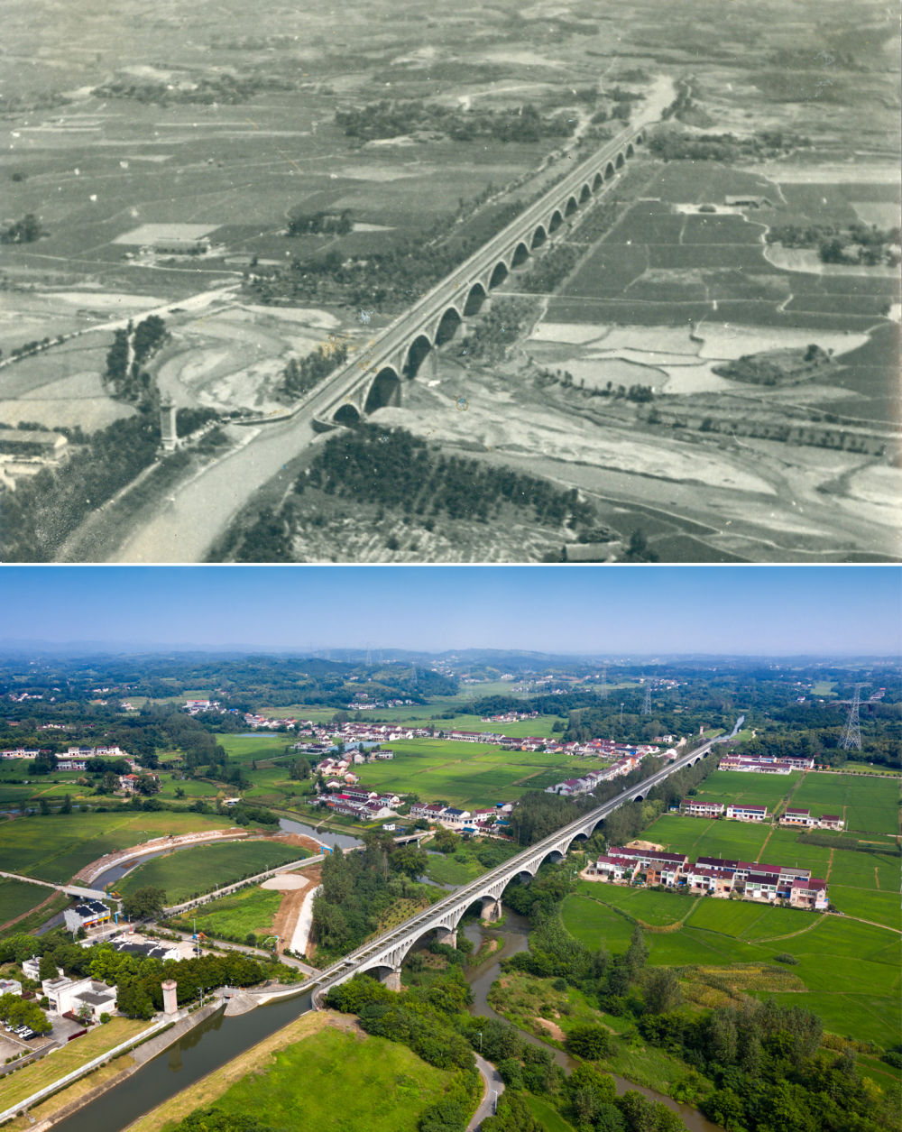 ↑这是一张拼版照片。上图为:1972年拍摄的位于安徽省六安市舒城县的将军山渡槽(新华社发 田准摄);下图为:2023年8月15日拍摄的将军山渡槽(无人机照片,新华社发 蒋常虹摄)。新华社发