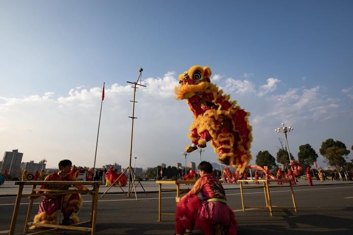 “好!”“漂亮!”2月18日,在霍山县政府广场,两条祥龙、两头彩狮忽上忽下,翻腾跳跃,当其中的一头狮子爬上3米多高的单杠,吐出写有“国泰民安 万事顺意”的彩色条幅时,全场观众热烈欢呼、齐声喝彩。龙狮表演队还深入大街小巷巡演,为广大城区群众送去新春祝福。