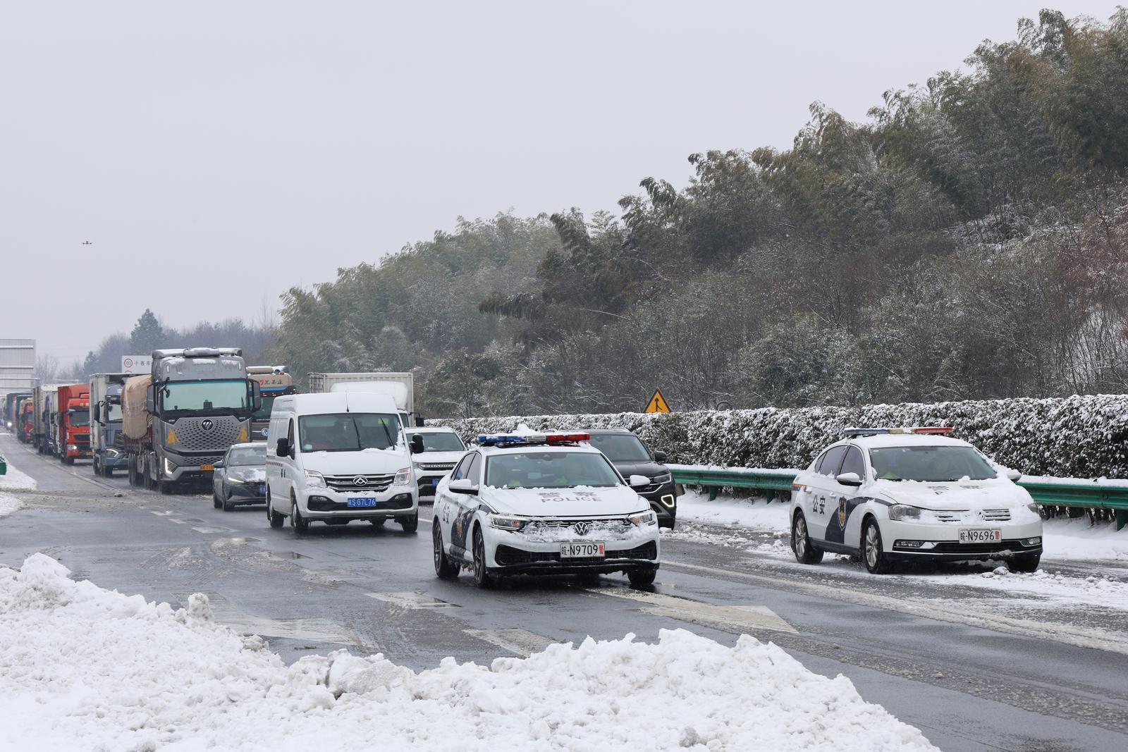 1月20日清晨,大雪渐停,G35高速霍山段,两辆警车上不断传出提示。在警车之后,200余量因大雪滞留的货车,轰响引擎,缓慢有序地驶离服务区,重新踏上行程。