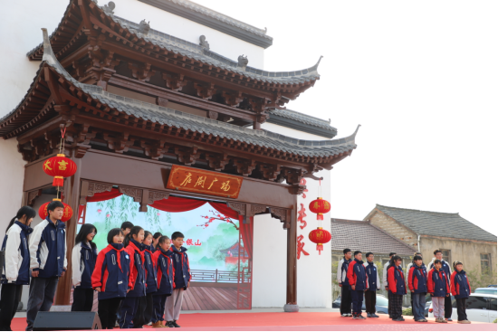 经典剧目演出结束后,创新节目精彩登场。一群身着校服的孩子登上舞台,带来新编庐歌《远近闻名美乡村》。他们虽未穿传统戏装,但稚嫩清澈的嗓音、纯真质朴的表演,让台下观众耳目一新。这首庐歌保留了西路庐剧“高亢激越、质朴苍劲”的唱腔风格,曲词中还融入了但家庙镇的风土人情与文化历史底蕴。“山风送来香阵阵,万亩油茶绿意盈……‘但说无妨’形式新,干群关系更加亲……”孩子们用清亮的嗓音,唱出了家乡的生态之美、发展之变。