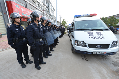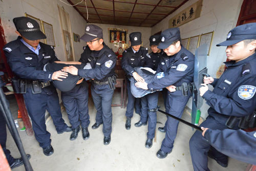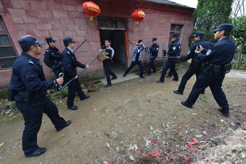 演练以两名“抢劫匪徒”逃窜至护国寨山顶,进入农家挥斧砍杀无辜村民为背景展开。接到警情后,县公安机关立即启动应急处置预案,公安局110指挥中心迅速通知巡逻防暴大队赶赴现场。巡防队员在接到指令后第一时间到场,与“匪徒”展开激烈搏斗,迅速形成合围之势,并将负隅顽抗的2名“匪徒”当场“生擒”。