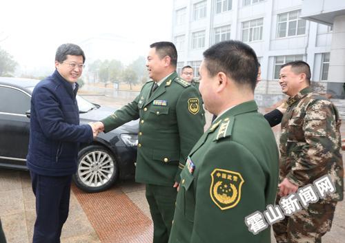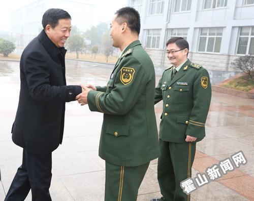 县委书记梁国金一行先后来到六安市军分区、市武警支队、市消防支队,代表县委、县政府和全县人民,向市驻军广大官兵致以新春的问候,汇报了霍山县2015年全县经济社会发展情况,并向各驻军部队为霍山经济社会发展给予的关心、支持表示衷心地感谢。梁国金说,在过去的一年里,霍山县面对经济下行压力不断加大、要素环境制约持续加剧、自然灾害严重冲击等困难和挑战,上下一心、扎实苦干,保持了全县经济社会各项事业的稳步发展。霍山的发展,离不开驻军各部队的广泛参与、积极支持和紧密配合,离不开广大官兵的无私奉献和团结奋斗,霍山人民与市驻军部队结下了深厚的感情。特别是在抗击“8.9”特大洪涝灾害中,市驻军部队挺身而出、义不容辞,同霍山广大干群一道,争分夺秒地拯救被困的群众,尽最大努力保护人民群众的财产免遭损失,迅速开展灾后重建工作,不仅将灾害的损失降到了最低,而且带领灾区群众尽快地恢复了生产生活,维护了社会大局和谐稳定。霍山县委、县政府和全县人民,对六安广大官兵的无私奉献表示的衷心感谢和崇高的敬意!