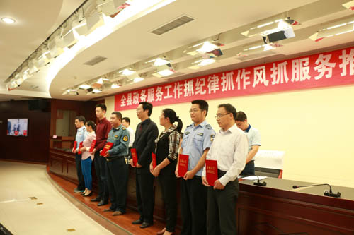 县政务服务中心负责人作了“抓纪律抓作风抓服务推进年”动员报告。县国税局、政务服务窗口负责人和年度服务明星代表分别上台作了发言。