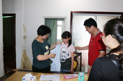 “小朋友,你是不是何家仪?还记得你写给我们的‘六一’心愿吗?这是罗叔叔给你买的礼物,你喜不喜欢?”在衡山镇文峰社区小家仪家中,团县委一行与她亲切交谈。“喜欢喜欢,谢谢阿姨!谢谢罗叔叔!”小家仪脸上洋溢着开心的笑容,连连对我们说着“谢谢谢谢”。家仪是一个单亲孩子,妈妈还身有残疾,家庭生活非常困难。但家仪是个懂事的孩子,虽然也羡慕那些穿好看衣服的同学,但她从不让妈妈帮她买,她偷偷告诉我们要省钱给妈妈看病。