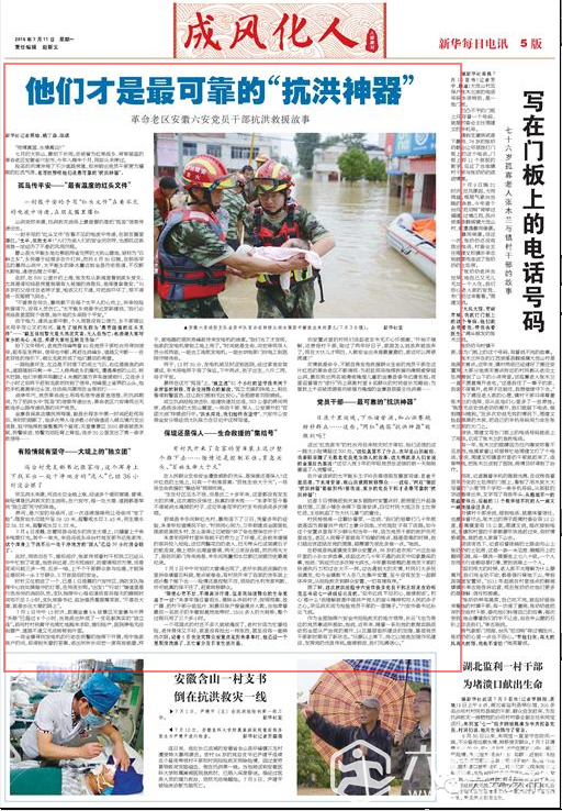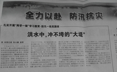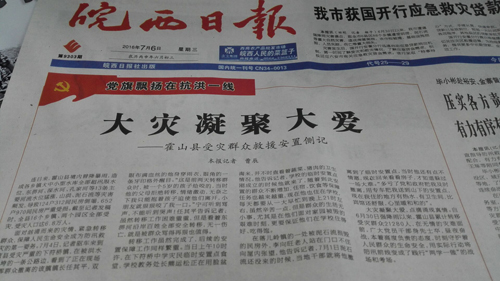 大灾凝聚大爱,点滴涌现真情。自6月30日强降雨以来,霍山县累计转移受灾群众21280人,在无情的灾难面前,广大党员干部身先士卒,昼夜奋战,本着高度负责的态度,时刻守护着人民群众的生命安全,用实际行动将防汛前线变成了践行“两学一做”的战场和考场。(本文刊登于《皖西日报》头版头条 作者:曹辰)