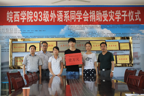 近日,皖西学院93级外语系同学会代表张显余在县委讲师组负责人的陪同下来到诸佛庵中学,慰问灾区受灾学子,并为他们送来了慰问金。