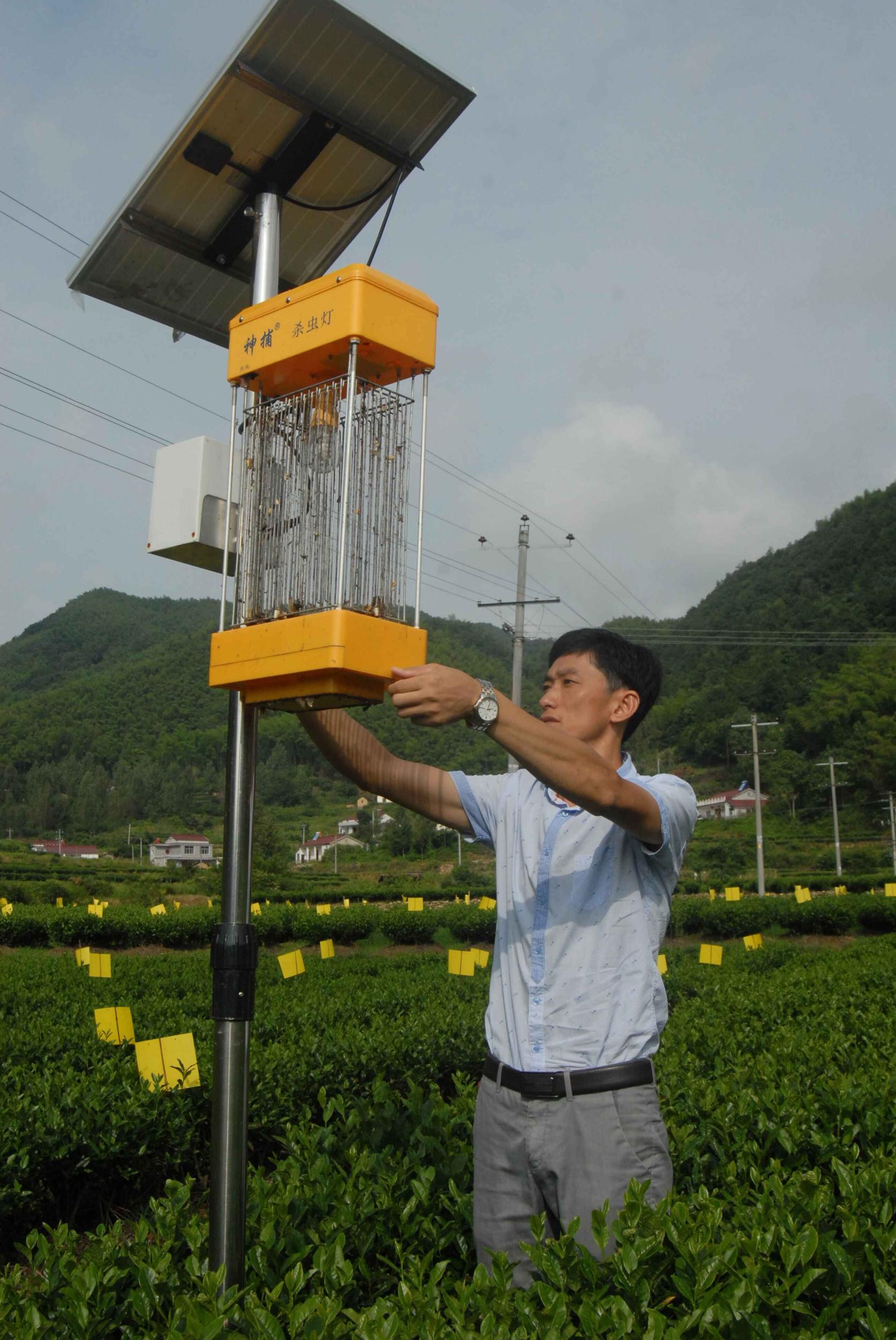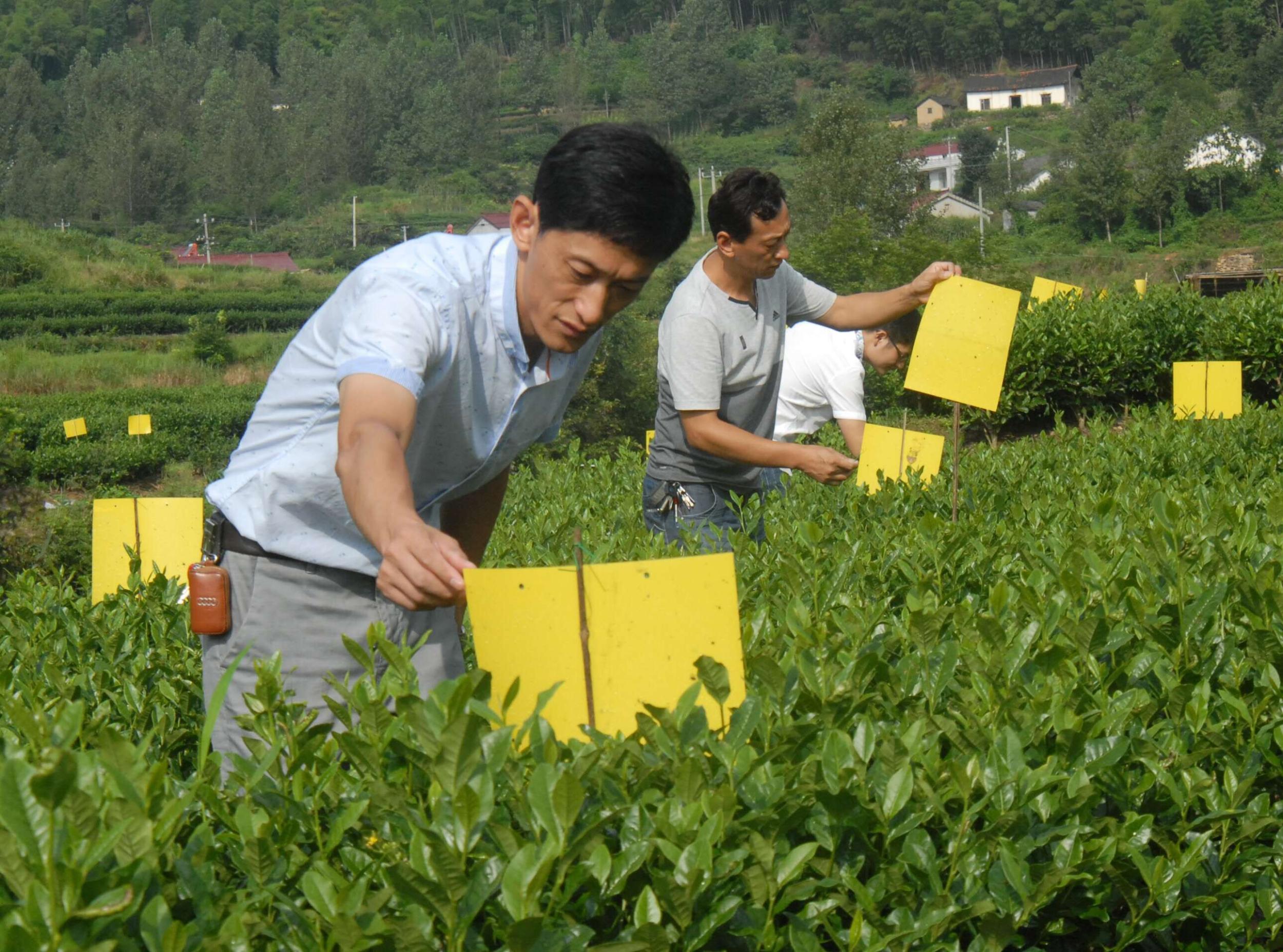 图为8月16日,霍山县乌米尖继才精品贡茶农民专业合作社的茶农在茶园里安插粘虫板。乌米尖继才精品贡茶农民专业合作社茶园坐落于佛子岭镇长岭村乌米尖,在该地建有高标准茶叶基地900亩,这里平均海拔700米左右,竹茂林幽,溪涧交错,常年云雾缭绕,雾蔼氤氲,气候温和,雨量充沛,独特的小气候条件,孕育了该地茶叶良好的品质,是霍山黄芽的源产地和主产地之一。 (刘容海)