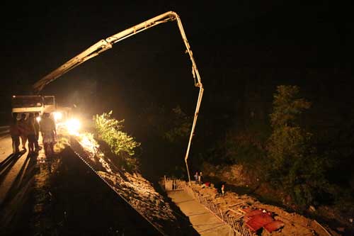 8月28日21时许,晚风习习,夜色朦胧,而位于S318线漫水河镇境内的水毁道路施工现场却是灯火通明、机声隆隆。备战在施工一线的路桥工作者发扬吃大苦、耐大劳和连续作战精神,为老区建设甘洒汗水,奉献智慧与力量。(刘 伟)