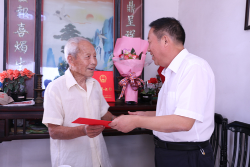 梁国金一行先后来到李道生、陈远来、万直霞三位退休教师家中,为老师们送上了鲜花和慰问金,并把由国家教育部、国家人力资源和社会保障部联合颁发的“乡村学校从教30年教师荣誉证书”亲自送到部分老师手上。