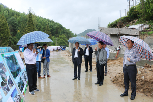 梁国金一行冒雨实地调研了漫水河镇新铺沟中心村建设现场,仔细询问了建房进度和灾民安置情况。