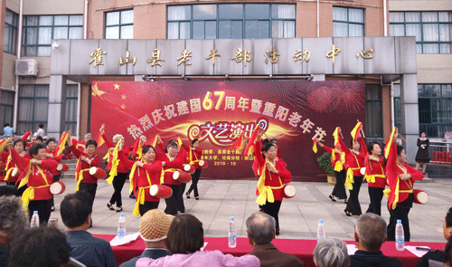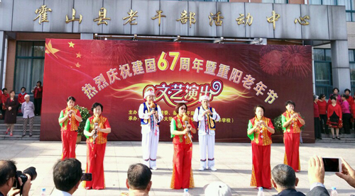 金秋十月,霍山县老干部活动中心广场数十棵桂花竞相绽放,花香四溢,为中华民族传统节日——重阳节的到来带来了一片惊喜和阵阵欢乐。10月9日下午,由县老教委、县委老干部局、县老龄委主办,县老年大学和县老年大学社保分校(衡山镇老年学校)承办的庆祝建国67周年暨重阳节文艺演出在县老干部活动中心隆重开幕。县处级老同志杨开文、邵必贵、吴巧生、张孝林、王先成、谭录林、周瑞祥等和县直相关单位负责同志、部分离退休干部、县老年大学及社保分校(衡山镇老年学校)学员近千人观看演出。