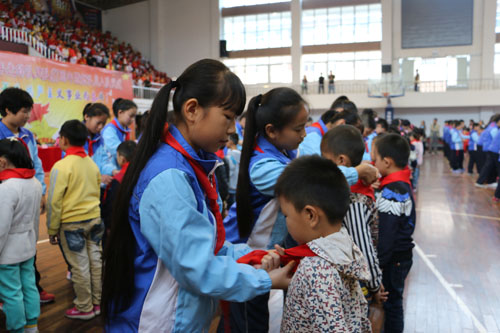 随着出旗曲的奏响,新队员入队仪式正式开始,全体师生敬礼并合唱少先队队歌。少先大队辅导员宣布了新队员名单,在场的高年级少年队员为新队员佩戴上了鲜艳的红领巾。新队员用稚嫩的声音作了入队宣誓,表达了坚定决心,要为胸前的红领巾增光添彩,不断进取。新队员代表发表了入队感言,团县委负责人为一年级新成立的4个中队授中队旗。