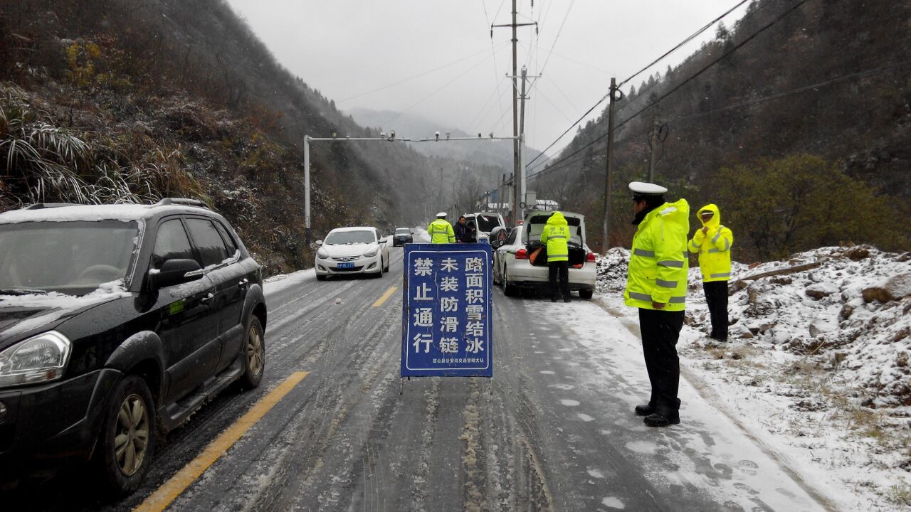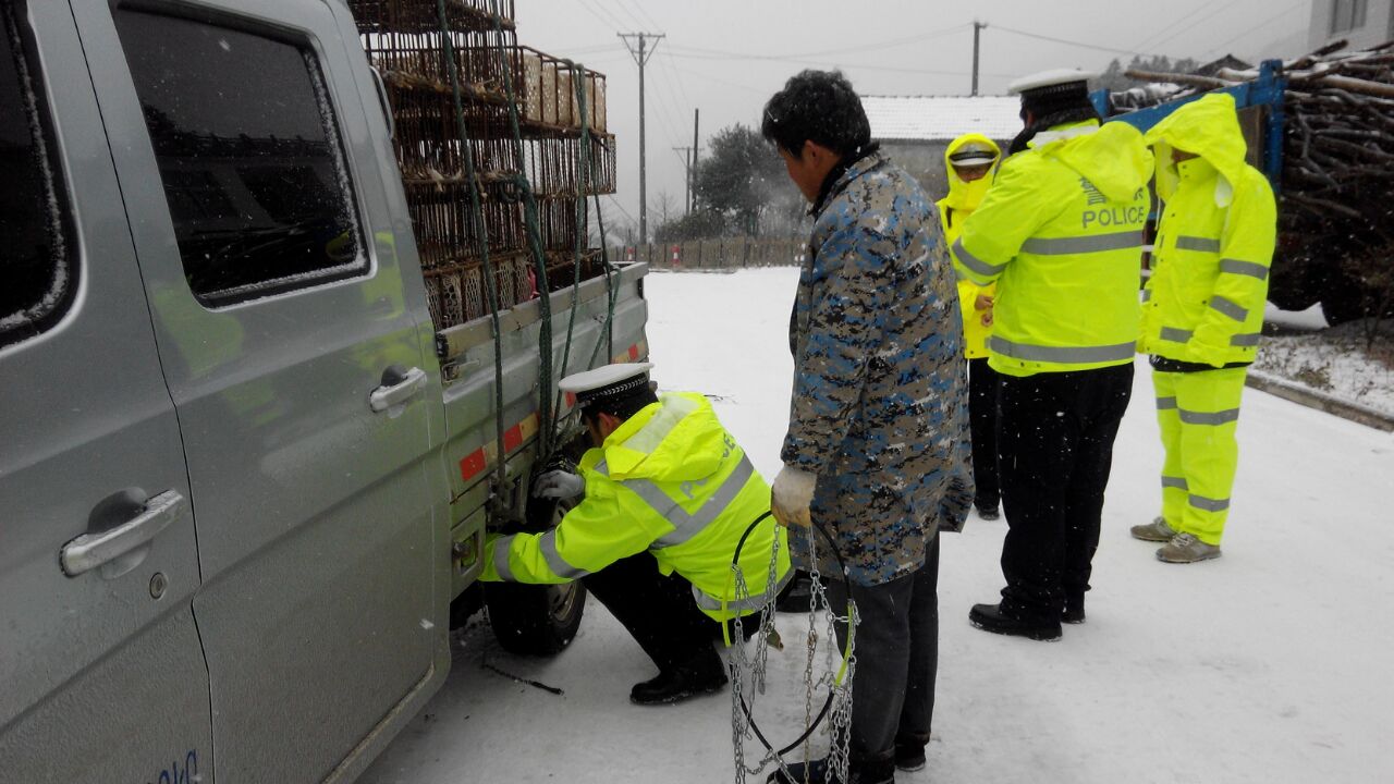 在行进过程中,民警发现沿途滞留了不少车辆,受困驾驶员见到民警甚是欣喜。到达现场后,民警召集驾驶员,讲解了雪地驾驶操作要领,并现场演示了防滑链的安装。后分别对受困车辆进行指挥疏导,推车、掩土。很快大部分车辆在民警的指挥疏导和帮助下安全越过了土地岭结冰路段。