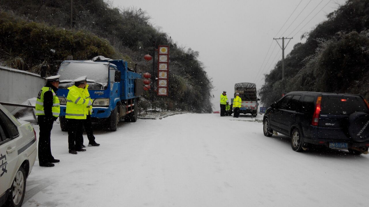 11月22日夜至23日,位于大别山区318省道的土地岭海拔1500多米的道路因下雪结冰,致使一辆满载芒硝的半挂车在离岭头不到100米弯道上坡处,车轮打滑陷进路里的深沟,造成过往车辆通行困难。得知消息后,县公安局交管大队教导员金昌平、副大队长陈纯带领民警从东侧沿318省道查看雪情路况、指挥疏导交通,漫水河中队民警从西侧沿土地岭进发赶往事发地。