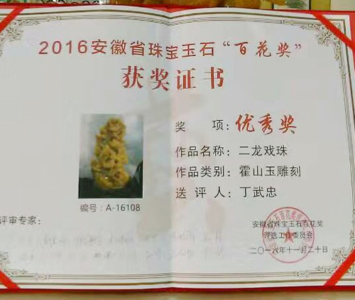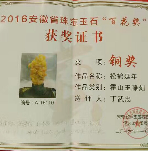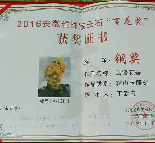 2016年11月18日,霍山县玉石文化传承研究会组织会员参加安徽省首届珠宝玉石类专业奖项百花奖评选活动。该协会精选的10件霍山玉作品在本次参加的一千余件作品中脱颖而出,全部获奖,共获得铜奖9件,优秀奖1件。