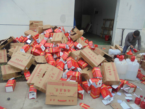 近日,霍山县市场监管局集中销毁一批查获的假冒侵权白酒,对其包装甁盒进行拆除,对瓶内白酒进行回收再处理。