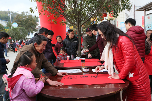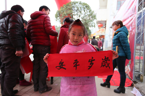元月19日,一乡村女娃在展示大红春联。当天,地处大别山腹地霍山县西南部深山区的漫水河镇街道人头攒动,热闹非常,一场以迎新春,送春联为主题的文化下乡活动正在这里激情上演。活动中,来自我省六安、舒城、霍山籍知名书法家现场挥毫泼墨,义写春联,为老百人民送上新年的祝福。(文/图 刘伟)