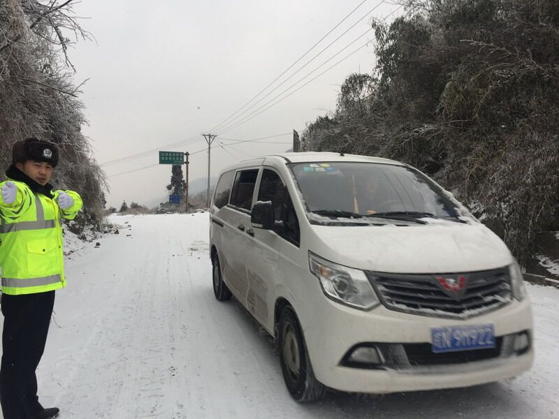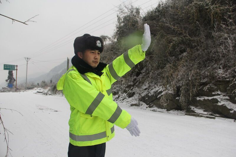 省道318线土地岭段,海拔近700米,因降雪导致路面结冰厚约3厘米。大队派出交警三中队、四中队共4辆警车、16名警力冒着零下三四度的严寒,坚守在冰雪路面一线,清雪保畅,扶危助困。路上有他们指挥车辆的靓丽身姿和疏导交通的忙碌足迹,冰雪路面有他们帮助被困车主的服务情怀,战冰雪,斗严寒,确保过往车辆的安全,保障了道路交通安全畅通。