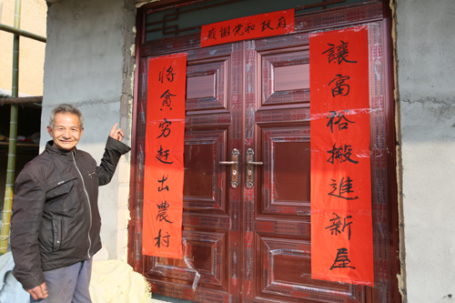 红红的对联贴在门上,幸福的笑容挂在脸上,感谢的话儿发自内心。春节期间,记者在漫水河镇一偏远乡村看到,村民陈卫在新居的大门上贴上火红的对联:“把贫穷赶出农村,让富裕搬进新屋。(横批)感谢党和政府”,字里行间表达对党和政府的感恩之情。该镇把特困户建房当作大事来抓,特事来办,2016年底,首批160余户特困户和异地扶贫搬迁户陆续搬进新居。(文/图 刘伟)