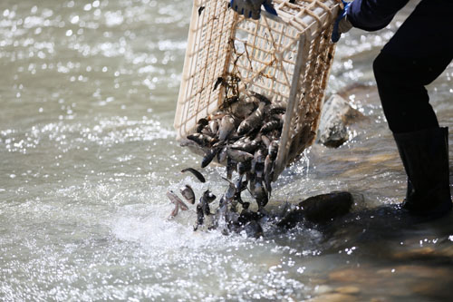 宽阔的水面清波荡漾,鱼儿欢唱。活动现场吸引了近百群众围观。这项活动很有意义,既公益又环保。居民程勇现场说。