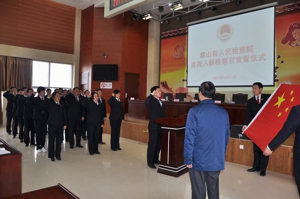 我宣誓:“忠于中华人民共和国宪法,维护宪法权威,履行法定职责,忠于祖国、忠于人民,恪尽职守、廉洁奉公,接受人民监督,为建设富强、民主、文明、和谐的社会主义国家努力奋斗!”洪亮高昂、整齐划一的宣誓声响彻霍山县人民检察院会议室。3月17日下午,该院首批21名入额检察官,在检察长李厚东的带领下,面向国旗,举起右拳,庄严宣誓。