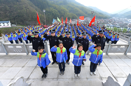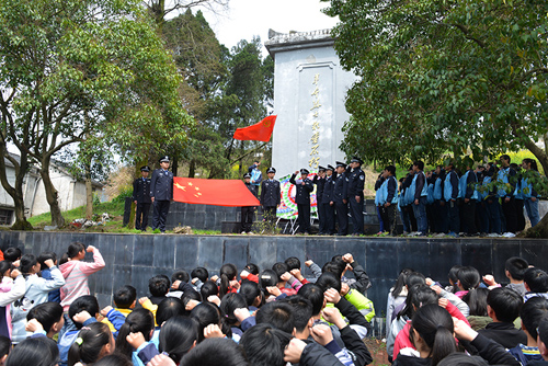 下午15时,大化坪革命烈士纪念碑前,奠祭的花圈整齐摆放,庄严肃穆,大化坪派出所民警和大化坪学校的近百名学生来到纪念碑前鞠躬敬礼,深切缅怀长眠在此的英烈。16时20分,交通管理大队民警来到因公牺牲交通民警申永刚墓前,献上了包含对战友的敬仰与思念的花篮,并静默致哀,表达对已故战友的缅怀之情。