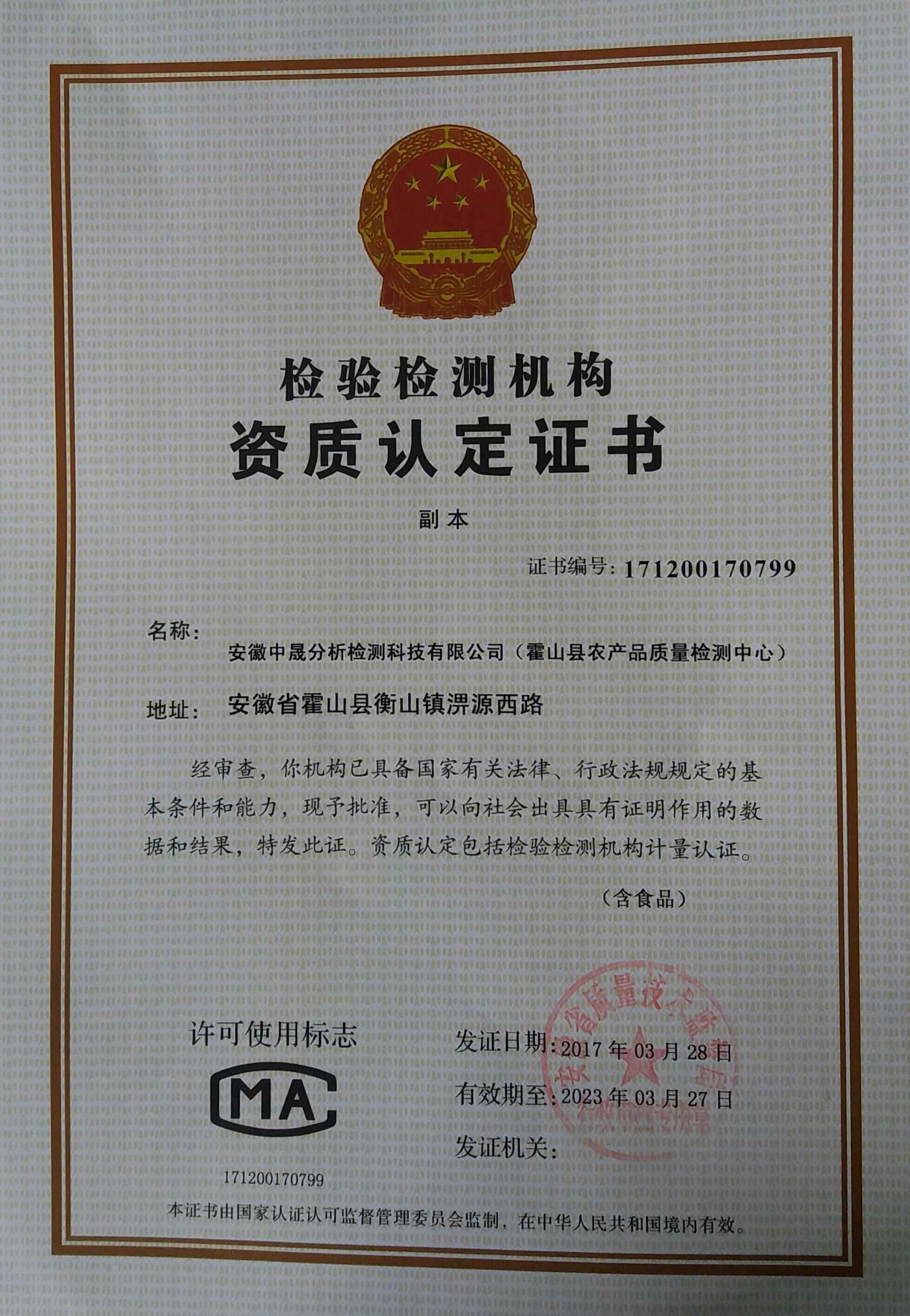 日前,安徽省中晟分析检测科技有限公司(霍山县农产品质量检测中心)正式通过安徽省质量技术监督局专家的评审,获得安徽省质量技术监督局颁布的检验检测机构资质认定证书,核定批准检测包括农产品、食品方面的参数429项。