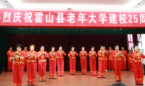 老年大学器乐班、腰鼓班、戏曲班和诗词班的学员们表演了自己精心准备的节目向学校建校25周年献礼。