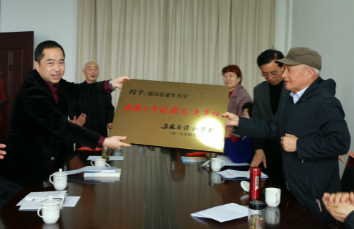 4月8日,省诗词学会会长、省炳烛诗书画联谊会会长陆世全一行来到霍山,授予县老年大学“安徽中华诗教先进单位”奖牌。副县长孙勇,县关工委主任、县诗联学会会长邵必贵及县老干局主要负责人等出席活动。