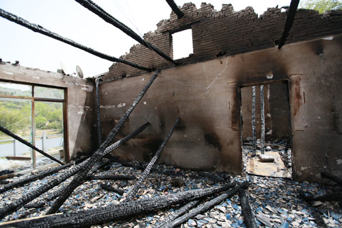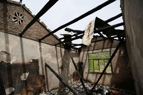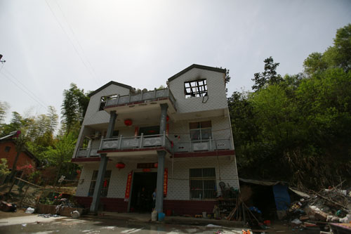 4月18日下午1时许,在位于S318线漫水河镇黄金山段公路旁一失火民房前,参与扑救的干警和当地群众才陆续开始安全撤离现场。