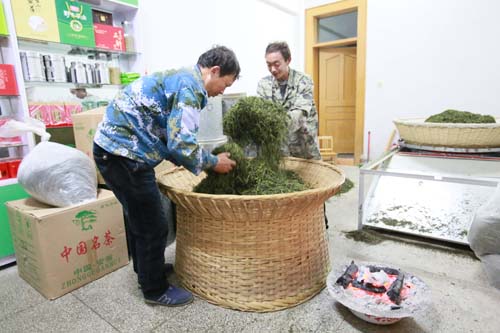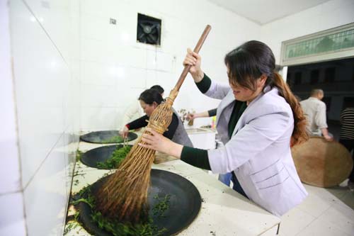 当晚,记者在霍山县漫水河镇看到,老式的土灶里木柴燃起红红的火焰,洁净的灶台前围满了热心的炒茶人,只见嫩绿的茶草在铁锅里上下翻滚,旧时的炒把在炒茶人的手中不停的飞舞……