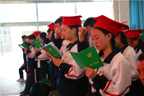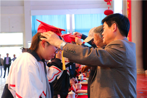 出席活动的领导、老师和家长为学生佩戴成人帽、成人徽章,颁发成人纪念册,大家一起见证了同学们成为共和国最年轻公民的重要时刻。成人仪式在同学们庄严的宣誓中结束。