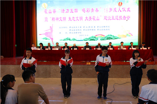 5月4日,由县关工委、团县委、教育局、文明办、环保局、旅游局共同主办,县文峰学校承办的霍山县“活力五四,喝彩青春”十八岁成人仪式暨“精神文明、生态文明、大美霍山”建设主题报告会举行,县关工委主任邵必贵,名誉主任王永超,副主任吴巧生、王先成,团县委、文明办、教育局、旅游局、环保局等单位负责人出席活动,文峰学校2000余师生参加活动。