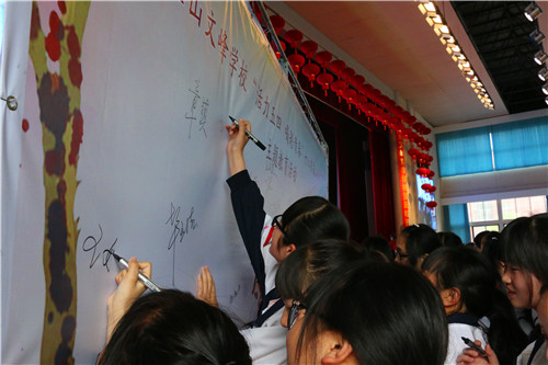 成人仪式后,县文明办、环保局、旅游局分别作了精神文明、生态文明、大美霍山建设报告会,全体同学在听完讲座后有序地走到签名墙前进行成人感恩签名。