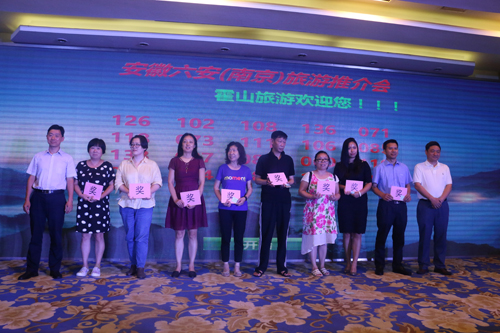 为进一步拓展南京旅游客源市场,6月30日下午,由六安市人民政府主办,霍山县人民政府、六安市旅游委员会承办的安徽六安•南京旅游推介会在南京市隆重举行。南京市副市长胡万进,六安市副市长孙军,霍山县县委书记梁国金,县人大常委会主任李玉武,县政协主席尹如江,县委常委、组织部长王光军,副县长张润之,以及来自南京、六安、霍山三地党政部门领导、旅游企业负责人、媒体代表、六安市旅游商品生产企业负责人300余人出席推介会。