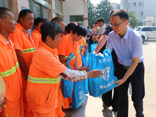 连日来,霍山县持续高温酷暑,坚守一线的环卫工人们牵动着领导的心。7月26日,县委副书记董永来率县委办、总工会、城管局等单位负责同志前往县环卫所为广大环卫工人送去防暑降温礼包。