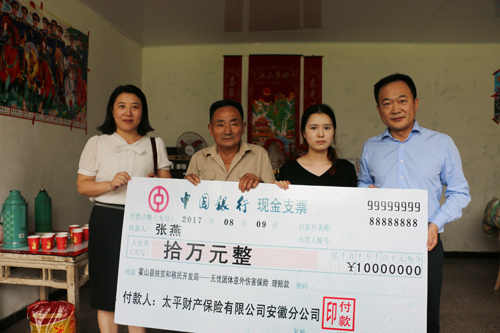 8月9日,太平财产保险有限公司安徽分公司相关负责人在县人大常委会副主任谢明及县扶贫和移民开发局负责人的陪同下,来到但家庙镇胡大桥村亡故村民张某某家中,看望其家人,为他家人送去10万元意外伤害保险理赔款,鼓励其家人早日走出痛苦的阴影、树立生活的信心。