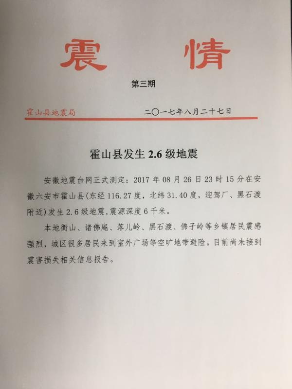 安徽地震台网正式测定:2017年08月26日23时15分在安徽六安市霍山县(东经116.27度,北纬31.40度,迎驾厂、黑石渡附近)发生2.6级地震,震源深度6千米。