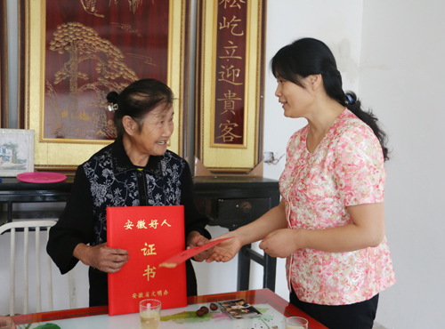 曹君为老人送上“安徽好人”提名奖证书和慰问金