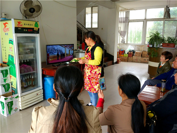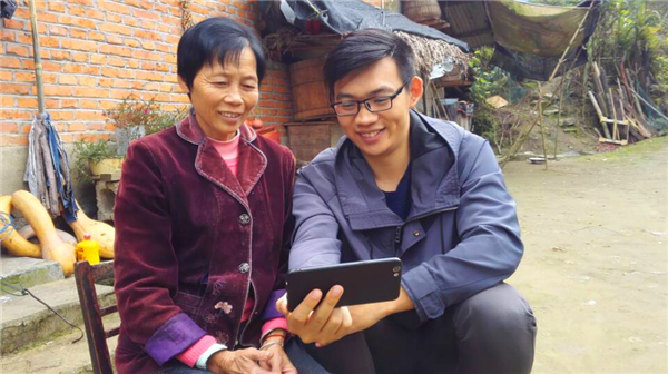 在贫困户家中,同她一起用手机收看见面会