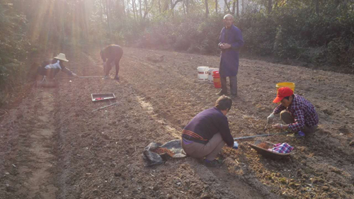 11月8日,霍山县与儿街镇真龙地村河东组中草药种植基地里,林农们正在热火朝天的栽植丹参等中药材,一片忙碌的景色。