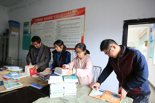 11月17日,霍山新华书店工作人员在漫水河镇径树林村村部搬运并整理图书。
