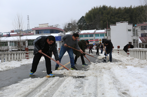 1月5日,漫水河镇机关党员干部职工积极响应县委、县政府号召,纷纷自带工具,走向街道和S318线部分路段,铲积雪保畅通,以实际行动践行党的十九大精神。(刘伟)