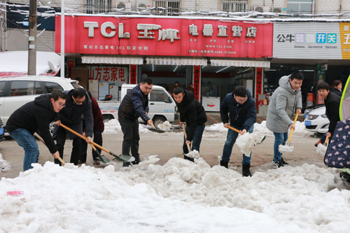 1月5日,霍山县组织干部职工走上街头,在城区各条主干道开展扫雪除冰工作。