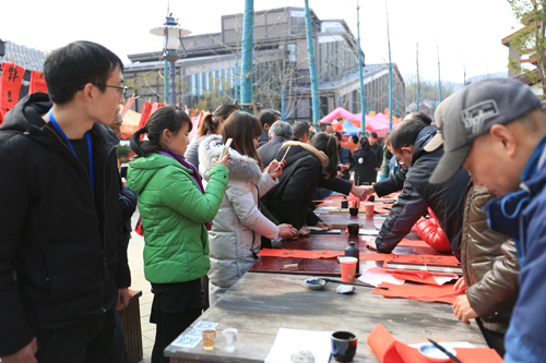 据介绍,此次活动由陡沙河温泉小镇和西山文化研究会联合举办。活动邀请到了霍山籍知名书法家怀才高、王甫涛等八位书法名家,他们均为安徽省书法家协会会员,其书法作品分别在国家、省、市等书法大赛上获得较高荣誉与奖项。“组织开展书法家进基层义务书写春联活动,是我会认真践行党的十九大精神的重要举措之一,通过企业搭台,文化唱戏这种途径与平台,进一步大力弘扬中华传统文化,为深山区群众送上高品味的精神文化食粮。”霍山县西山文化研究会黄从升秘书长现场介绍。