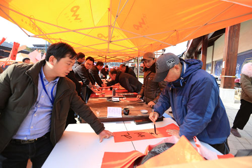 年货节里翰墨香,义写春联百姓乐。记者在陡沙河温泉小镇首届年货节上看到,临时搭建在宾馆大门口的创作台被围得水泄不通。书法家们挥毫泼墨,不辞劳苦,为十里八乡赶来的群众一一书写了春联。活动从上午一直持续到傍晚,共为当地群众义务书写了春联达460余副。深受深山区广大干群的欢迎。