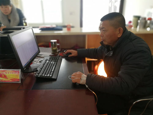 2月1日上午,记者在漫水河镇平田村采访时看到,该村村主任张涛在村部办公室一边打着点滴,一边还带病坚持在电脑上查看全村的扶贫软件资料。